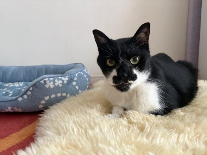 IKEAのムートン出したら元保護猫チョコがちんまり座ってました