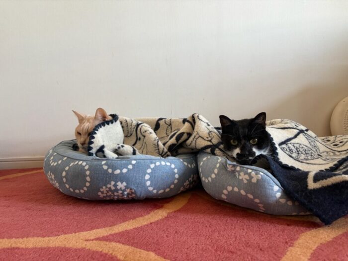 仲良しの元保護猫チョコ(右)とラテ(左)